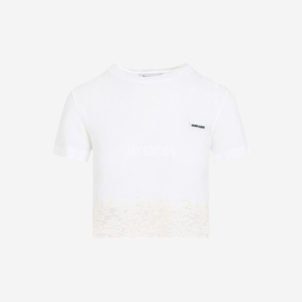 미우미우 로고 패치 레이스 패널 코튼 반팔 티셔츠